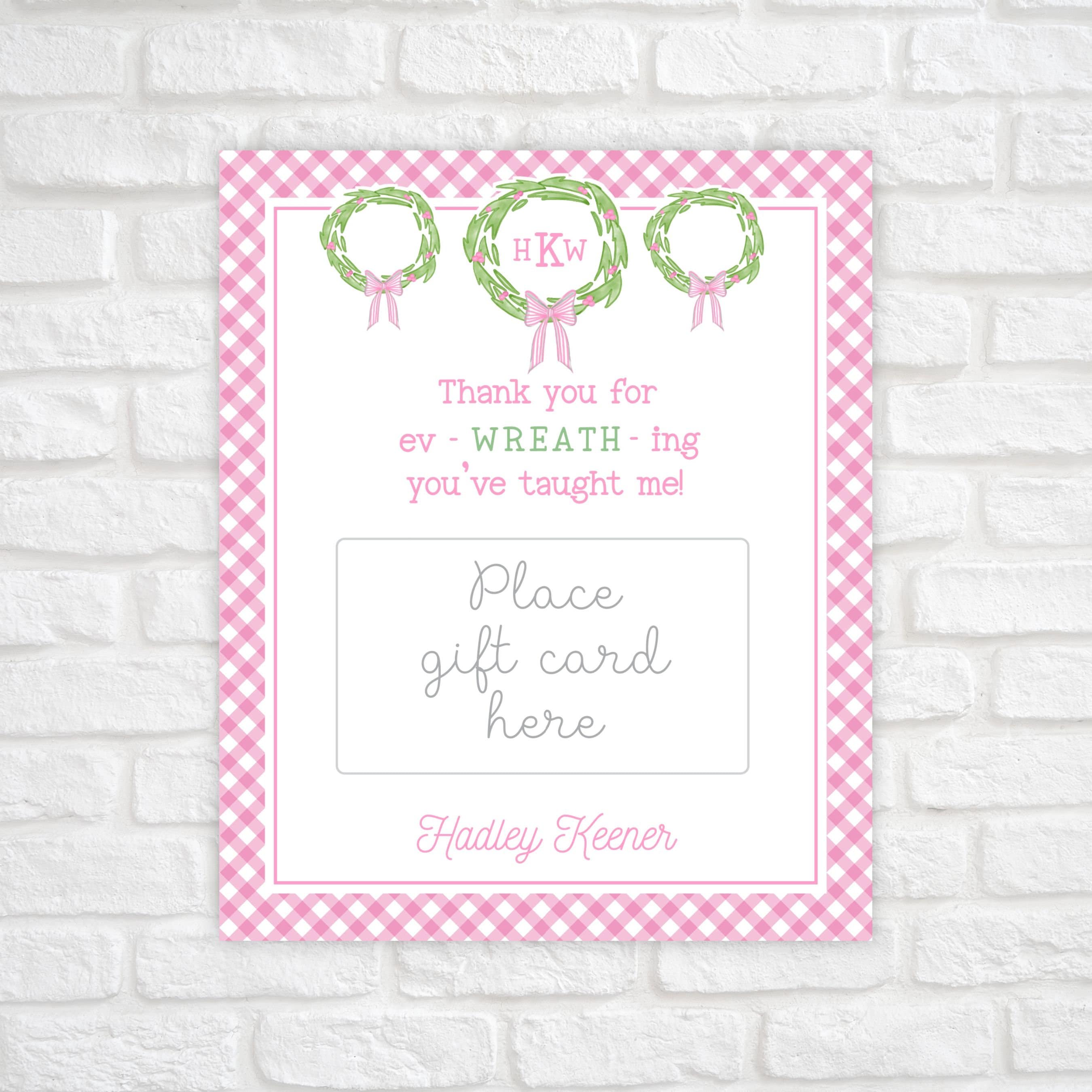 Printable 4.75" x 5.75" holiday wreath gift card holder tag for teachers. Show your teacher appreciation by giving them a fun gift card this holiday season and attaching it to this cute monogrammed gift card holder. To attach gift card, simply use a glue dot or piece of tape! Teachers, daycare workers, bus drivers, and administrators will all love receiving some much needed recognition this Christmas holiday season!