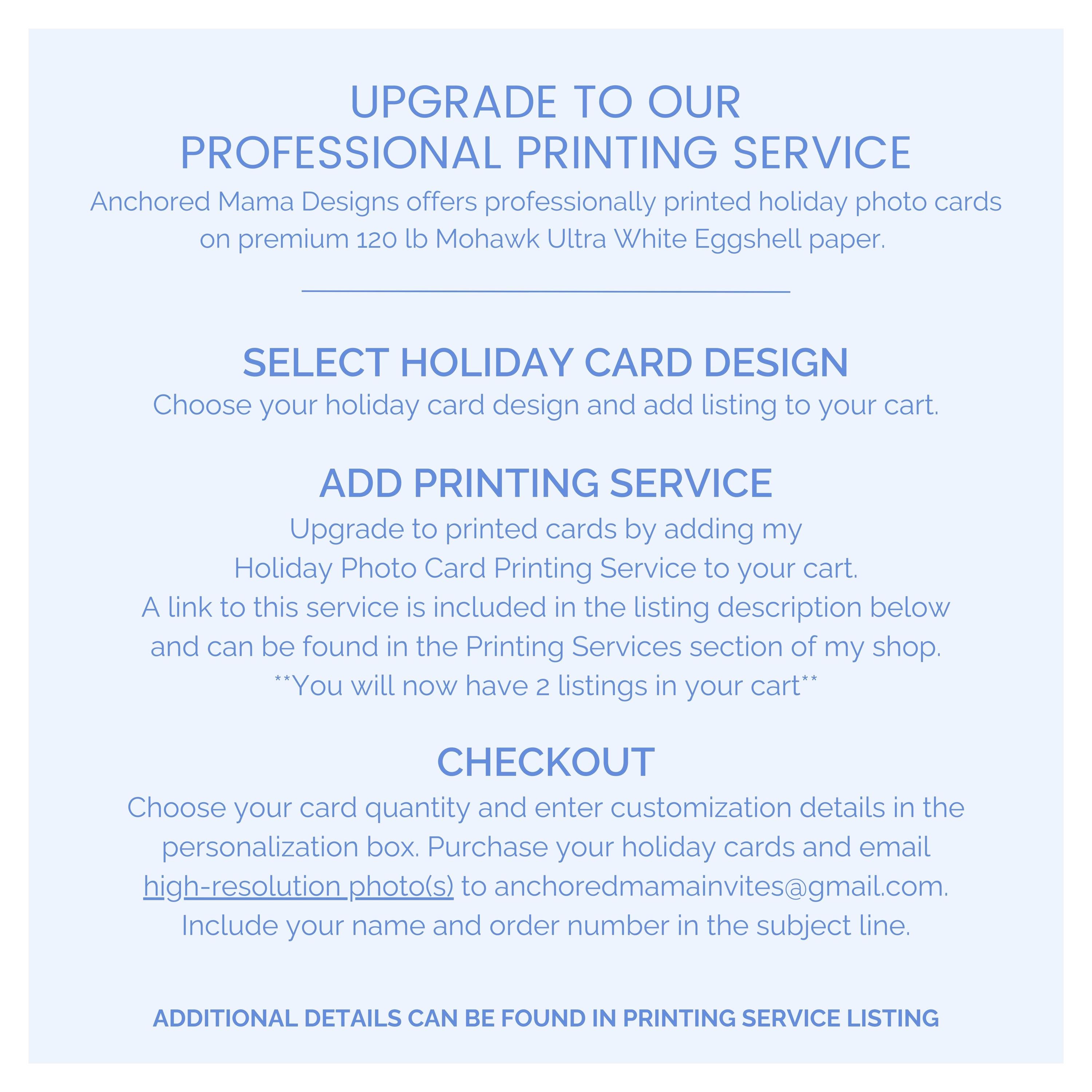 Anchored Mama Designs offers professional printing for cards and tags. This upgrade can be located in the Printing Services section of our shop. We partner with a professional printing company to provide beautifully printed products using 120 lb. Mohawk Eggshell Ultra White paper.