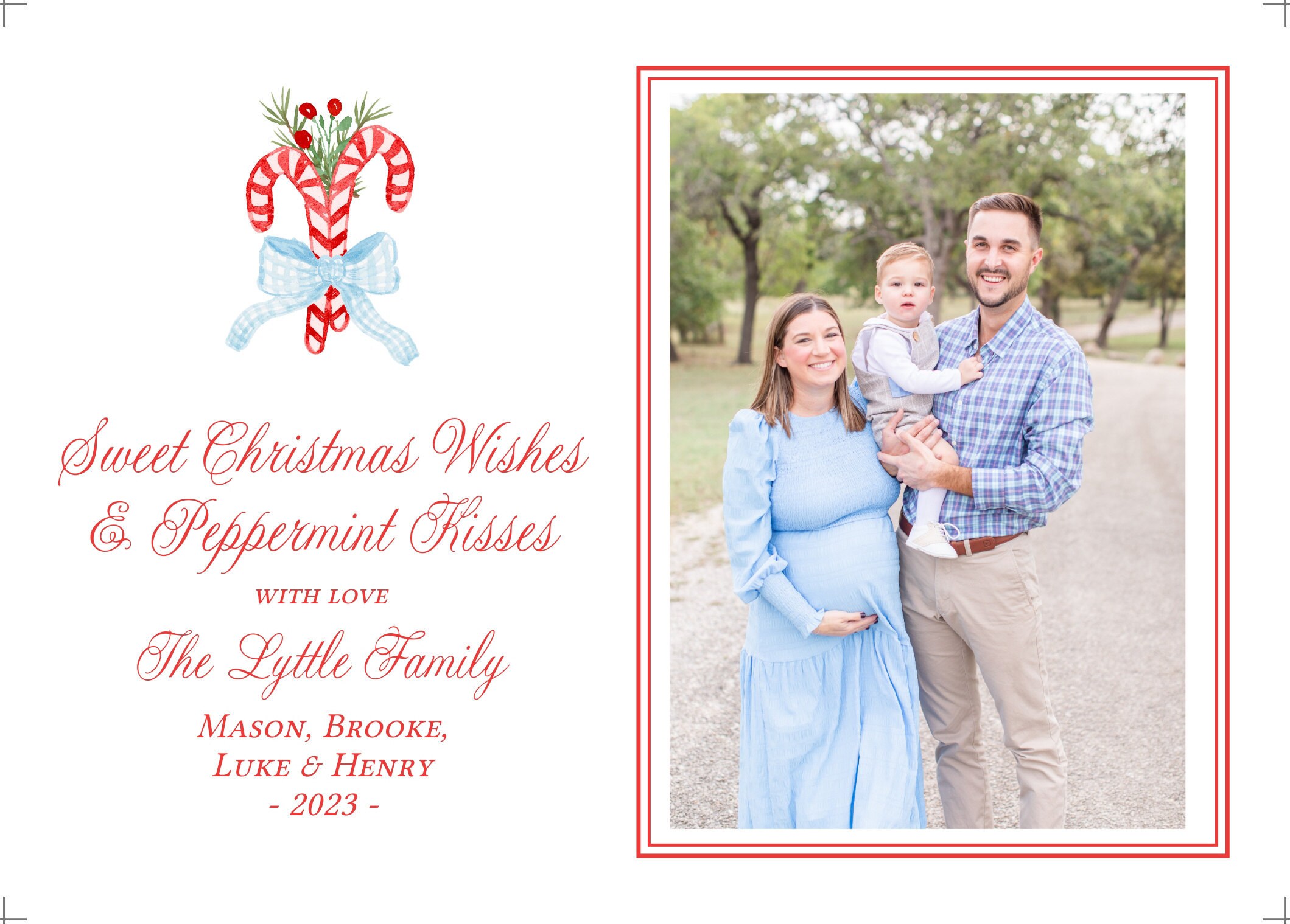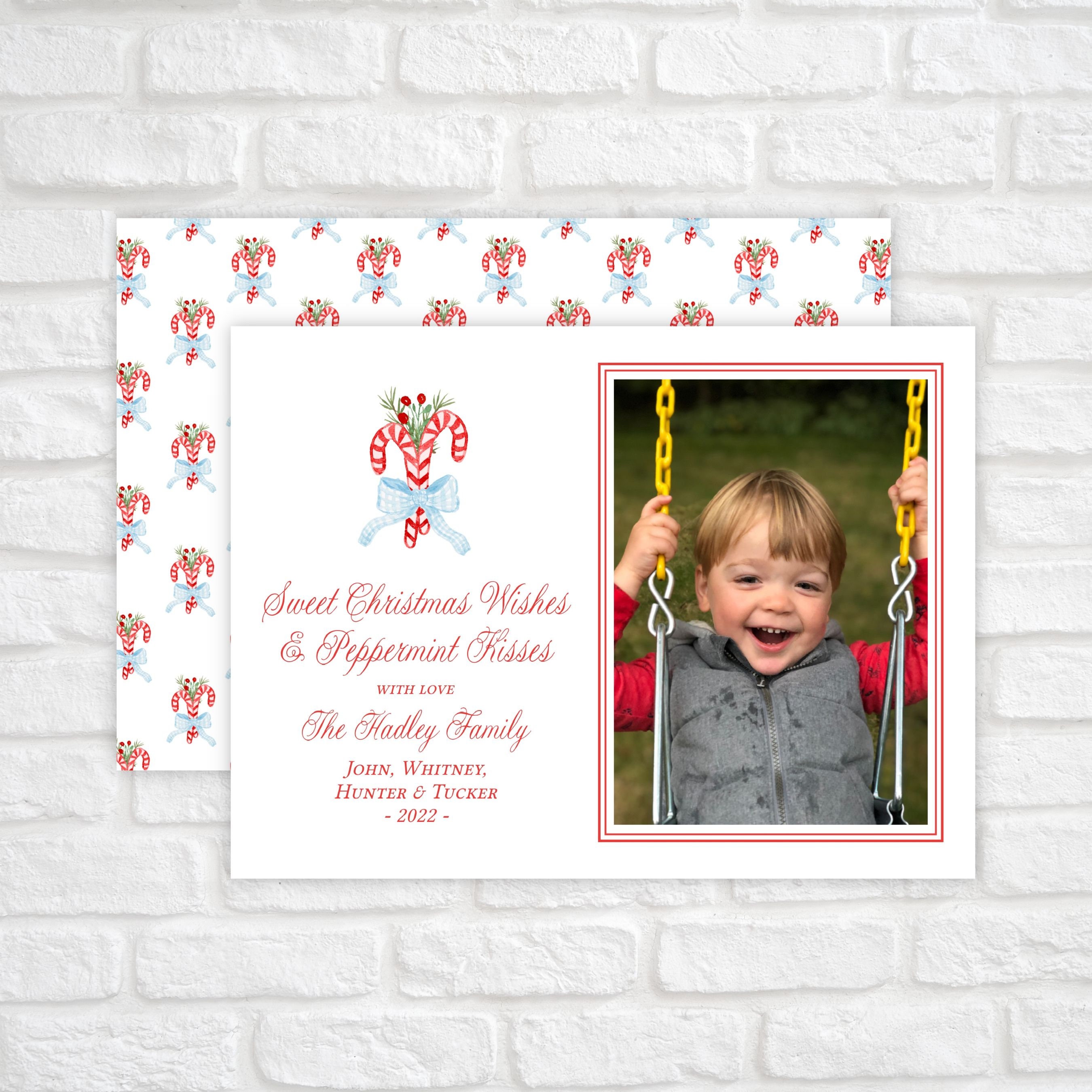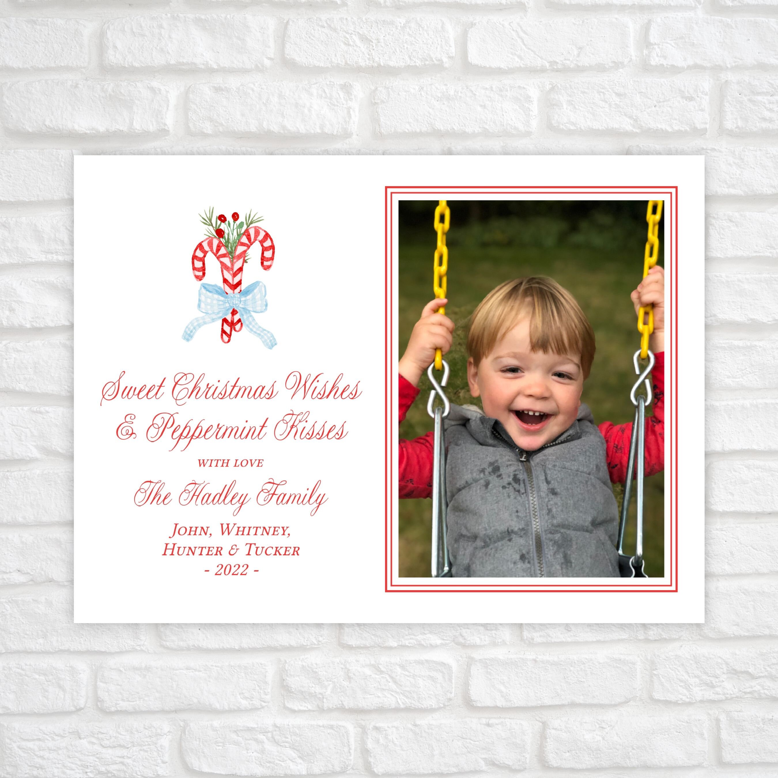 Grandmillennial 5"x7" printable blue bow and candy canes sweet Christmas photo card template. Easily self-edit your photo holiday card with your own text and photos, then download and print!