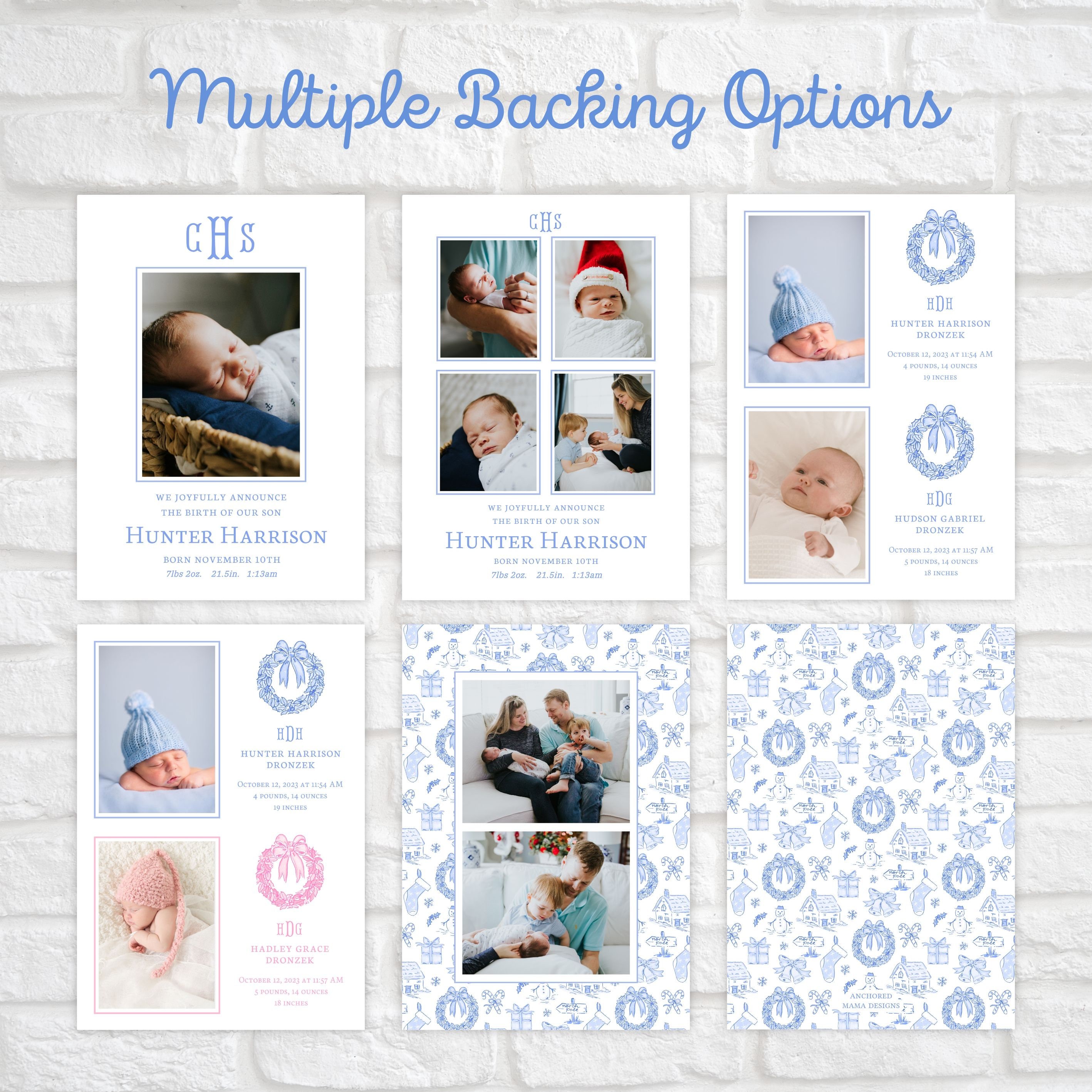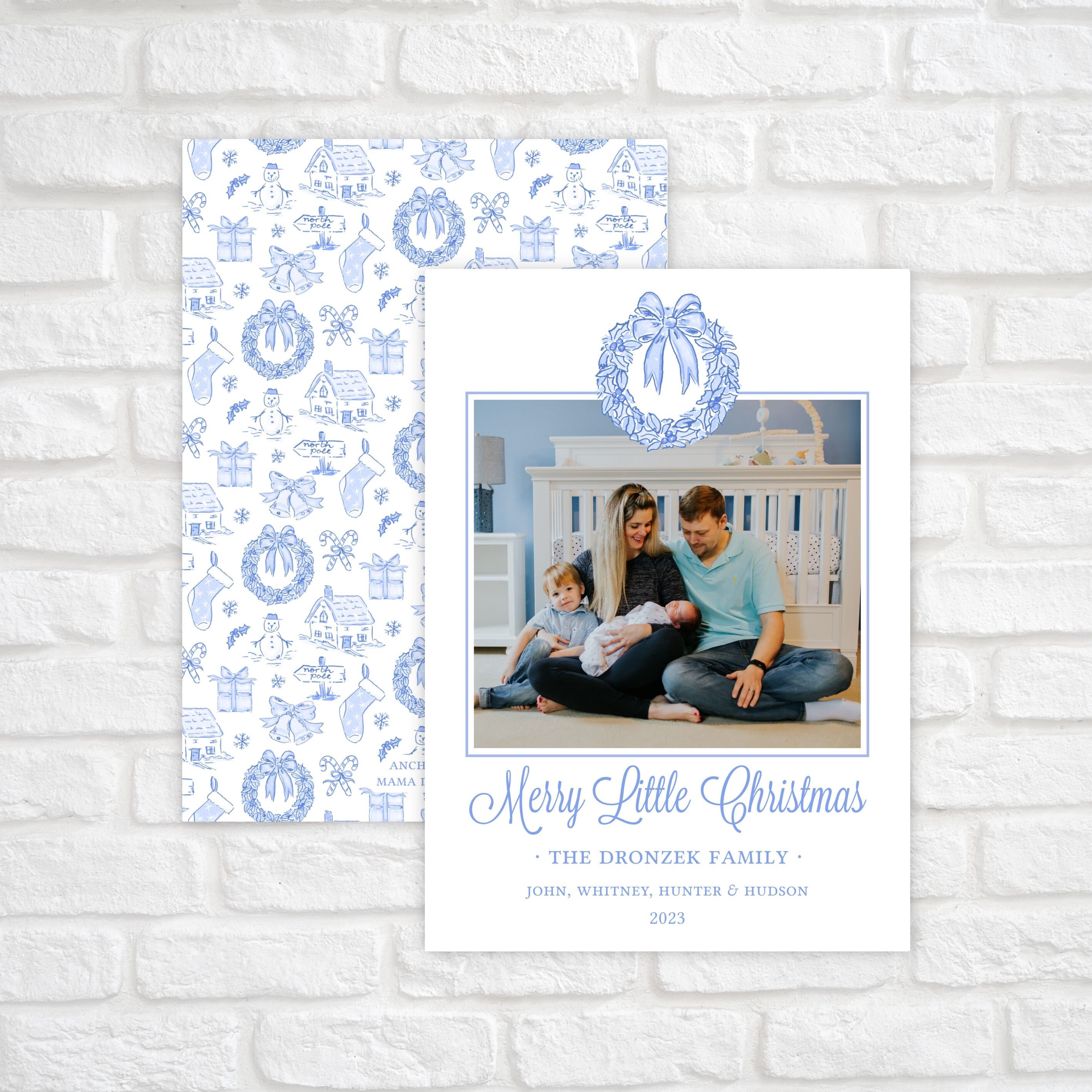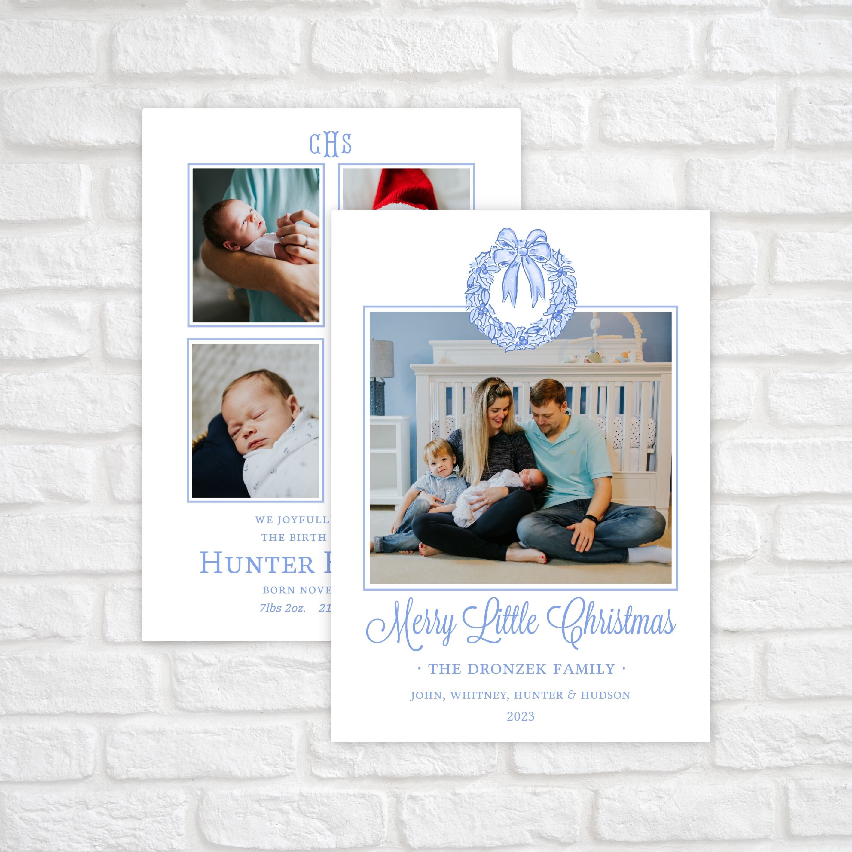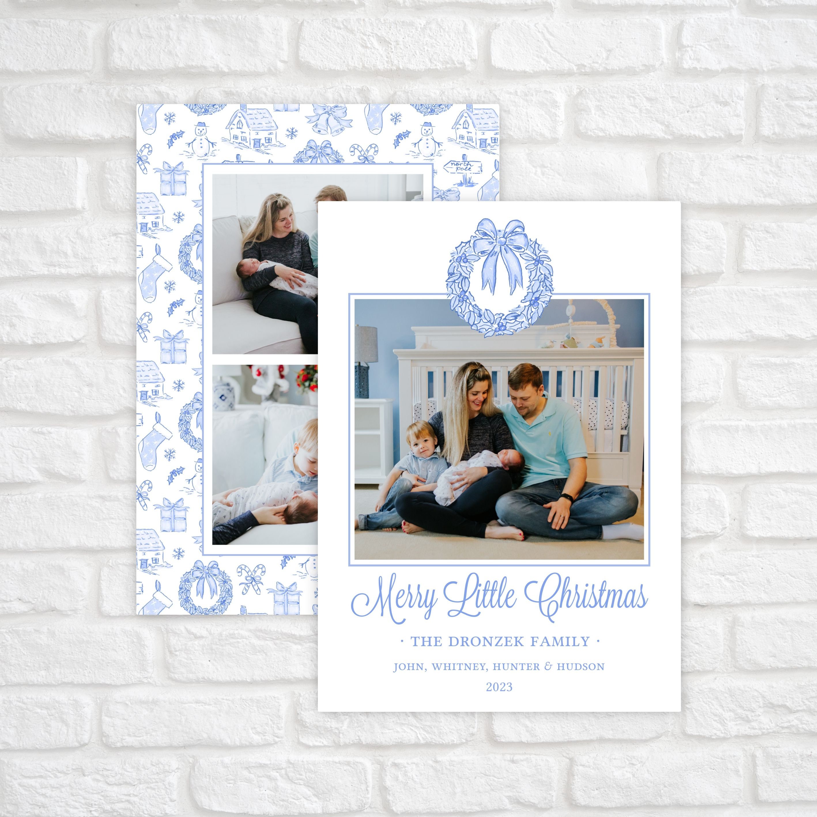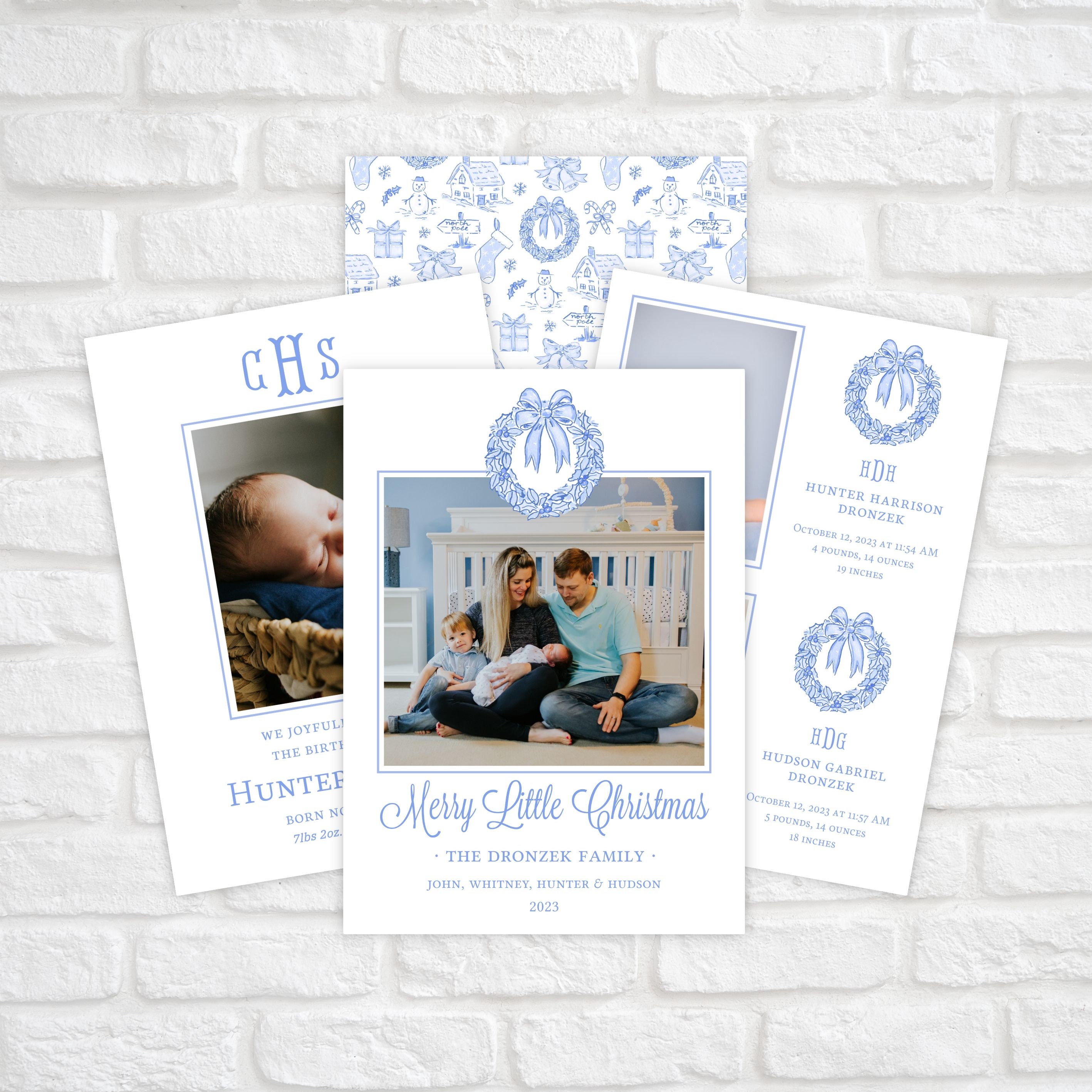 Classic 5"x7" printable blue holiday toile and wreath Christmas photo card baby announcement. Twin designs included. Easily self-edit your photo holiday card with your own text and photos, then download and print!