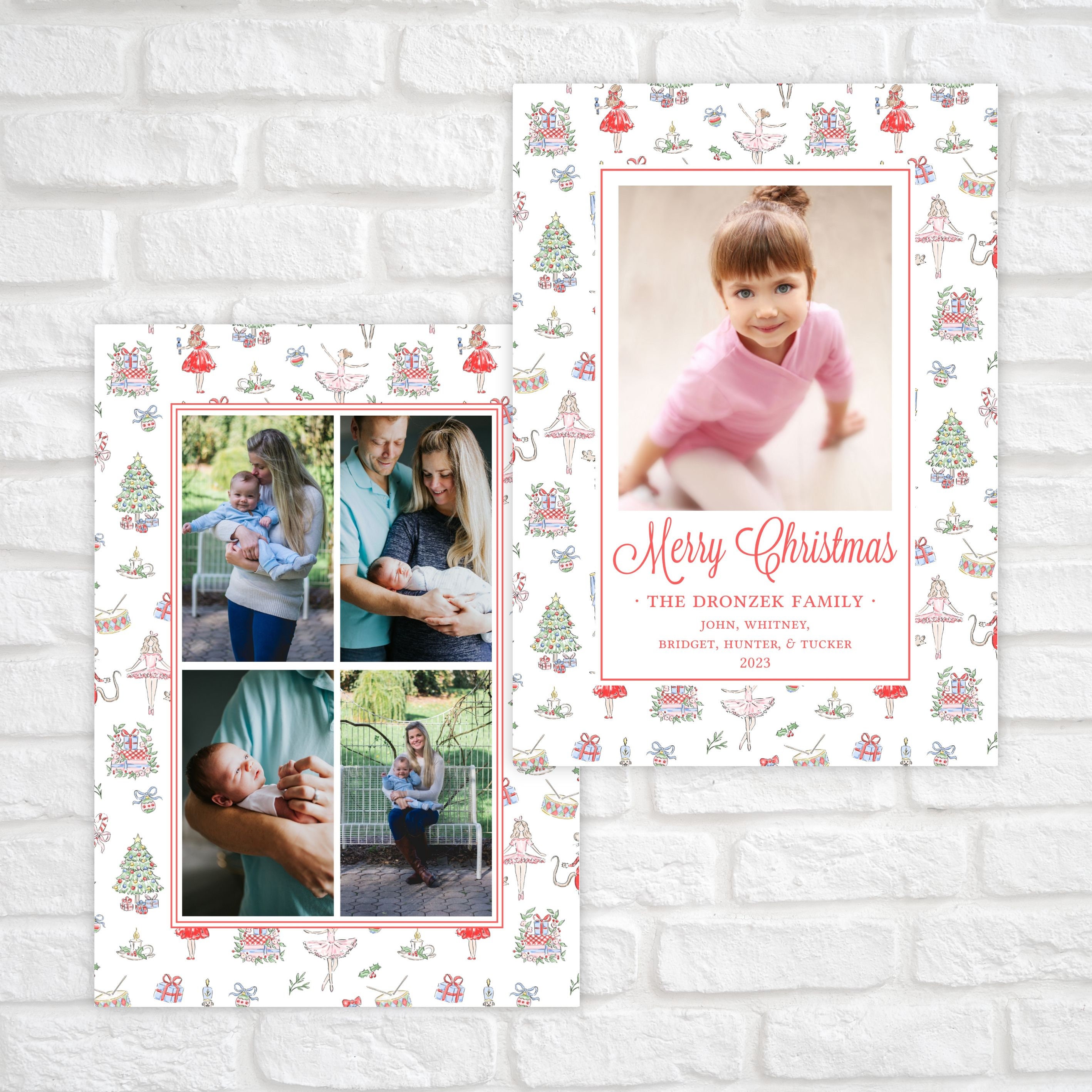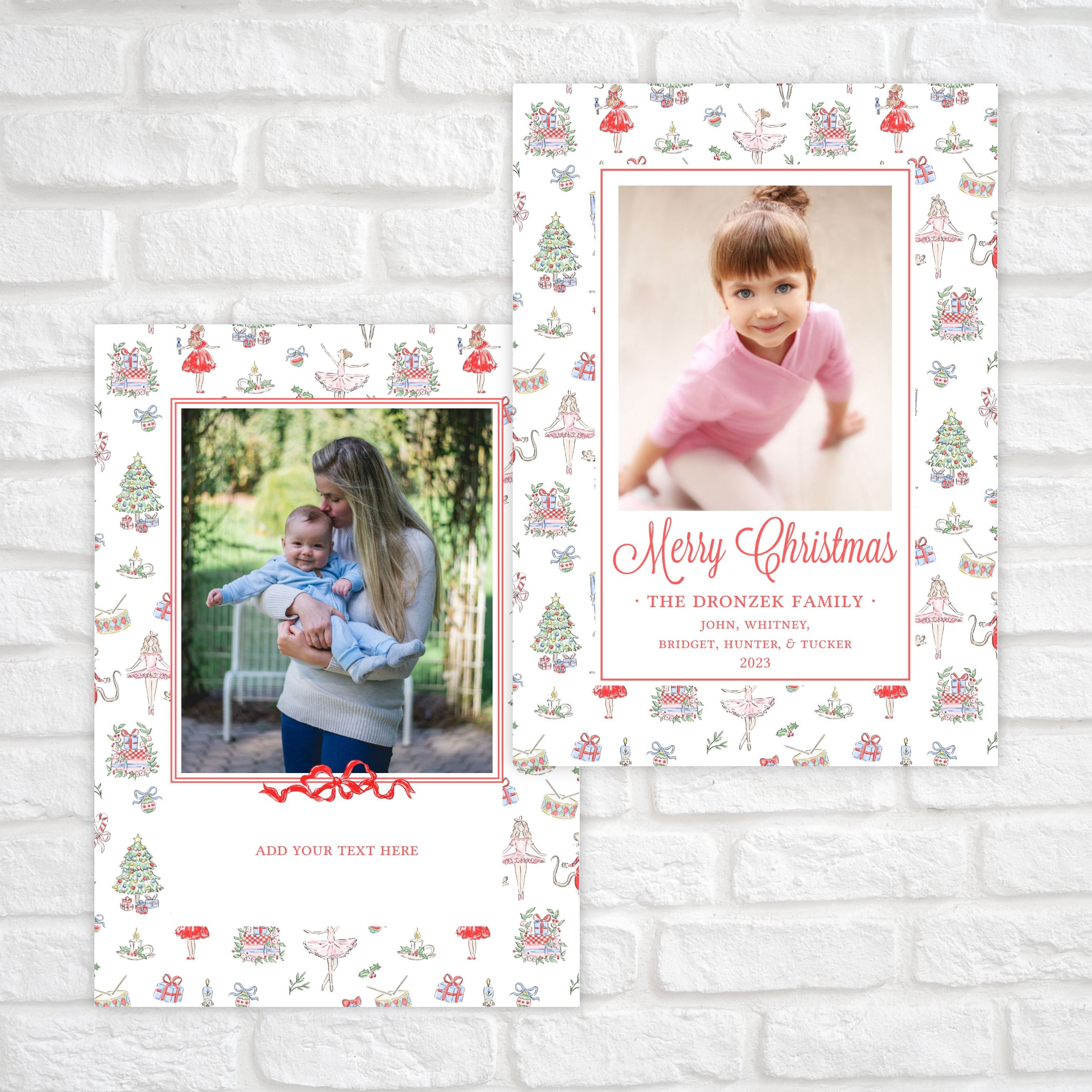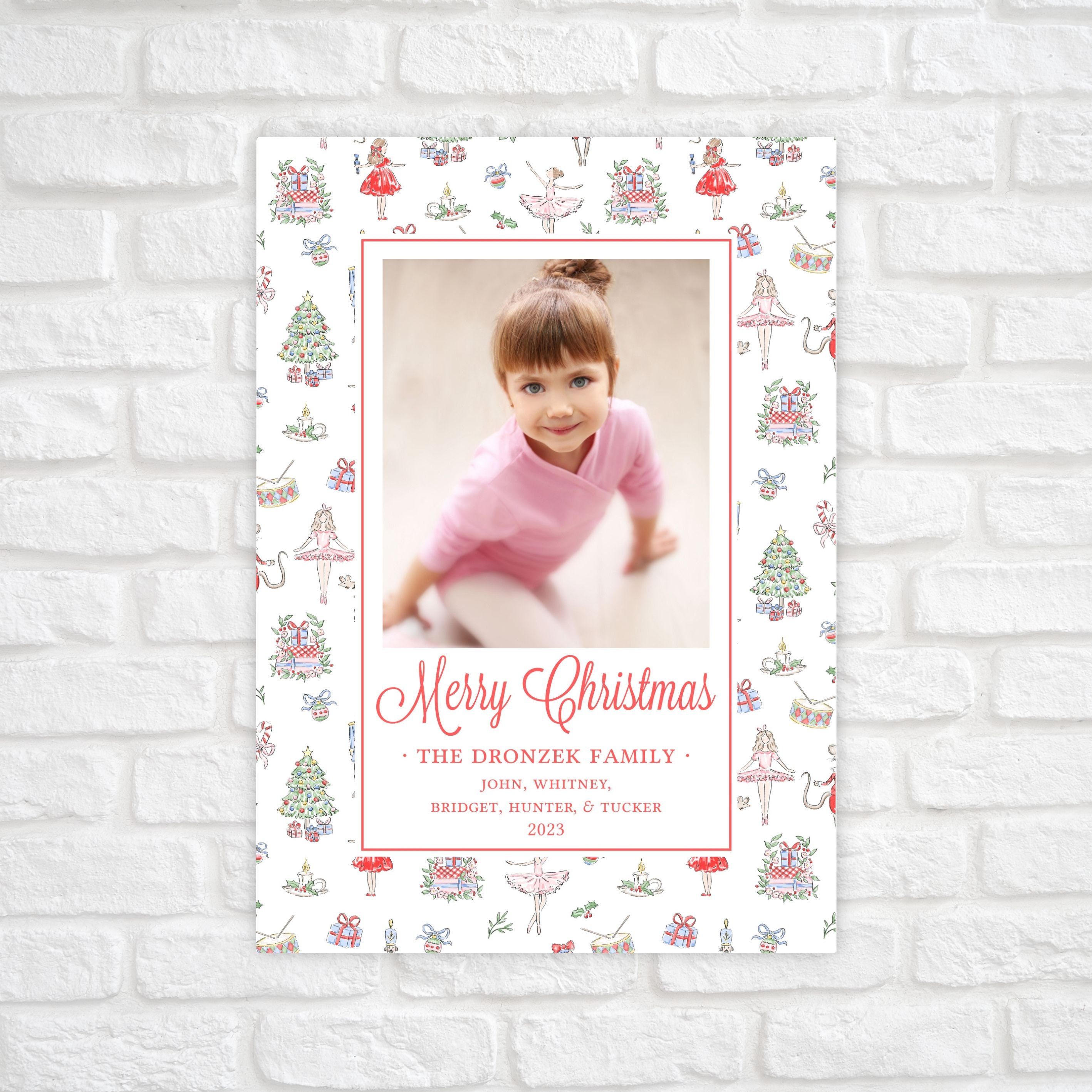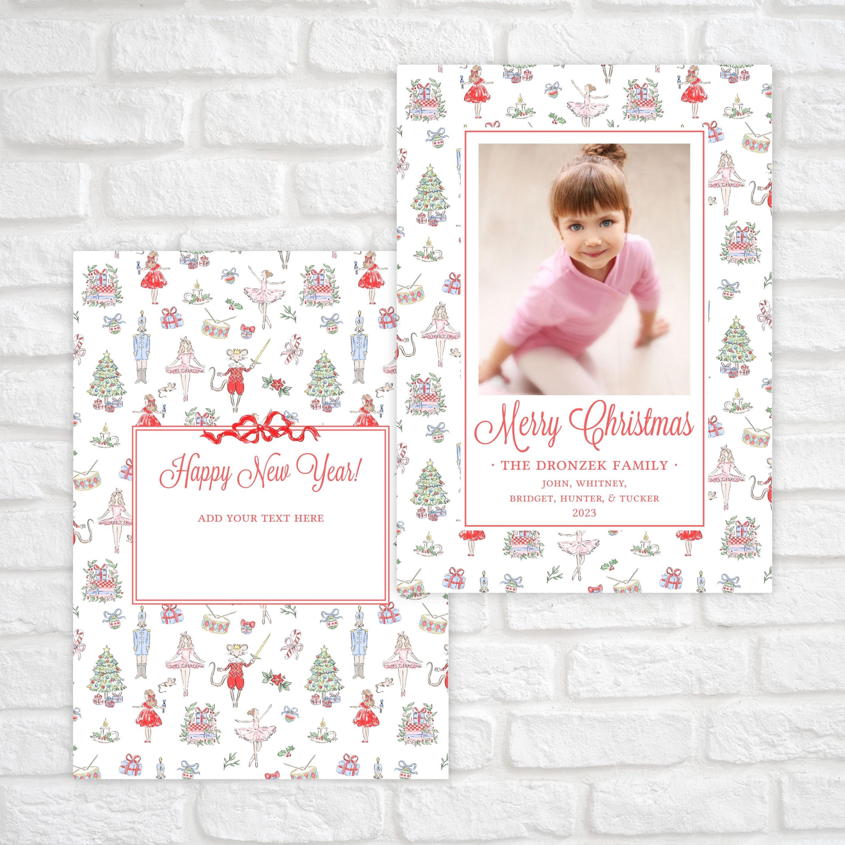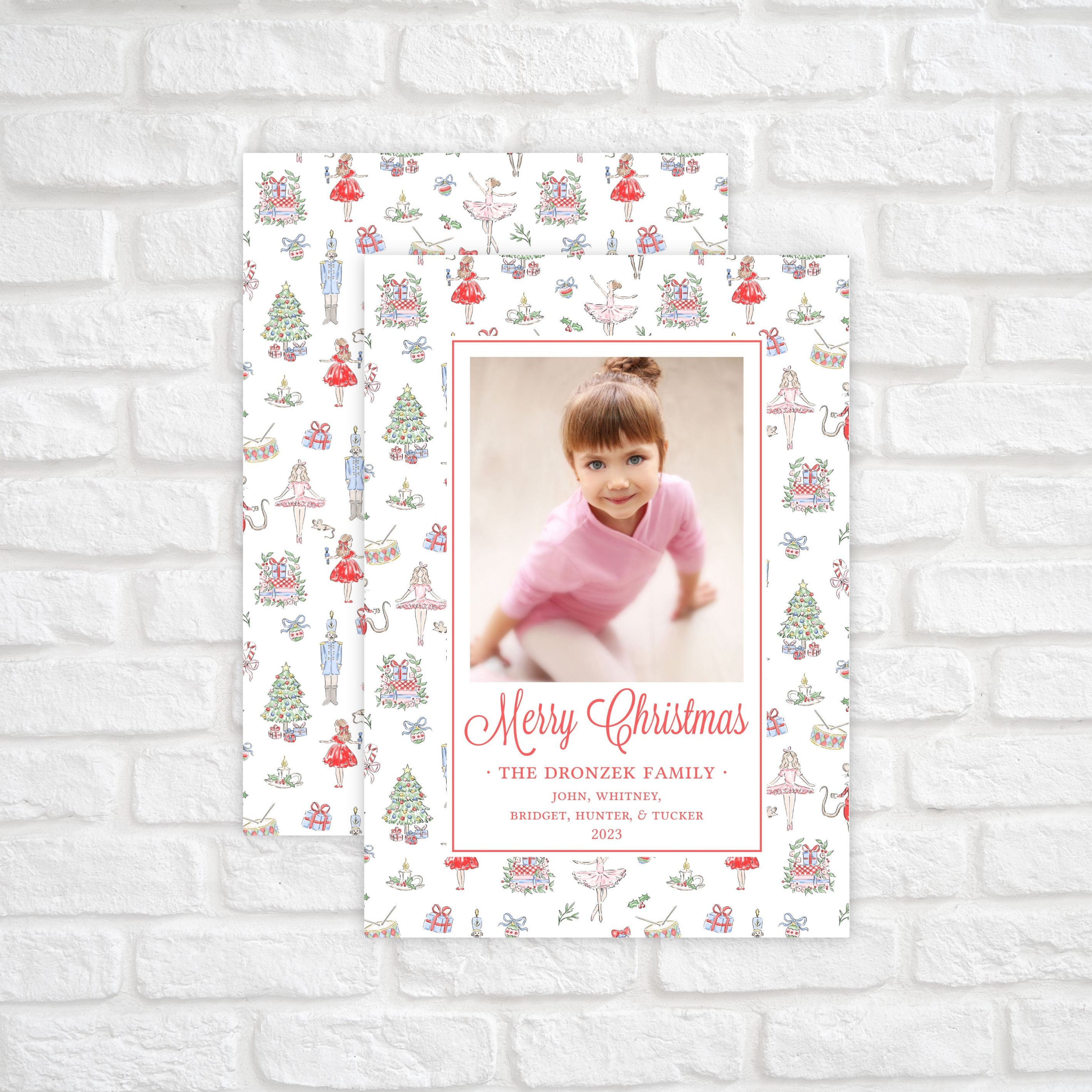 Classic 5"x7" printable watercolor Nutcracker ballet Christmas photo card. Easily self-edit your photo holiday card with your own text and photos, then download and print!