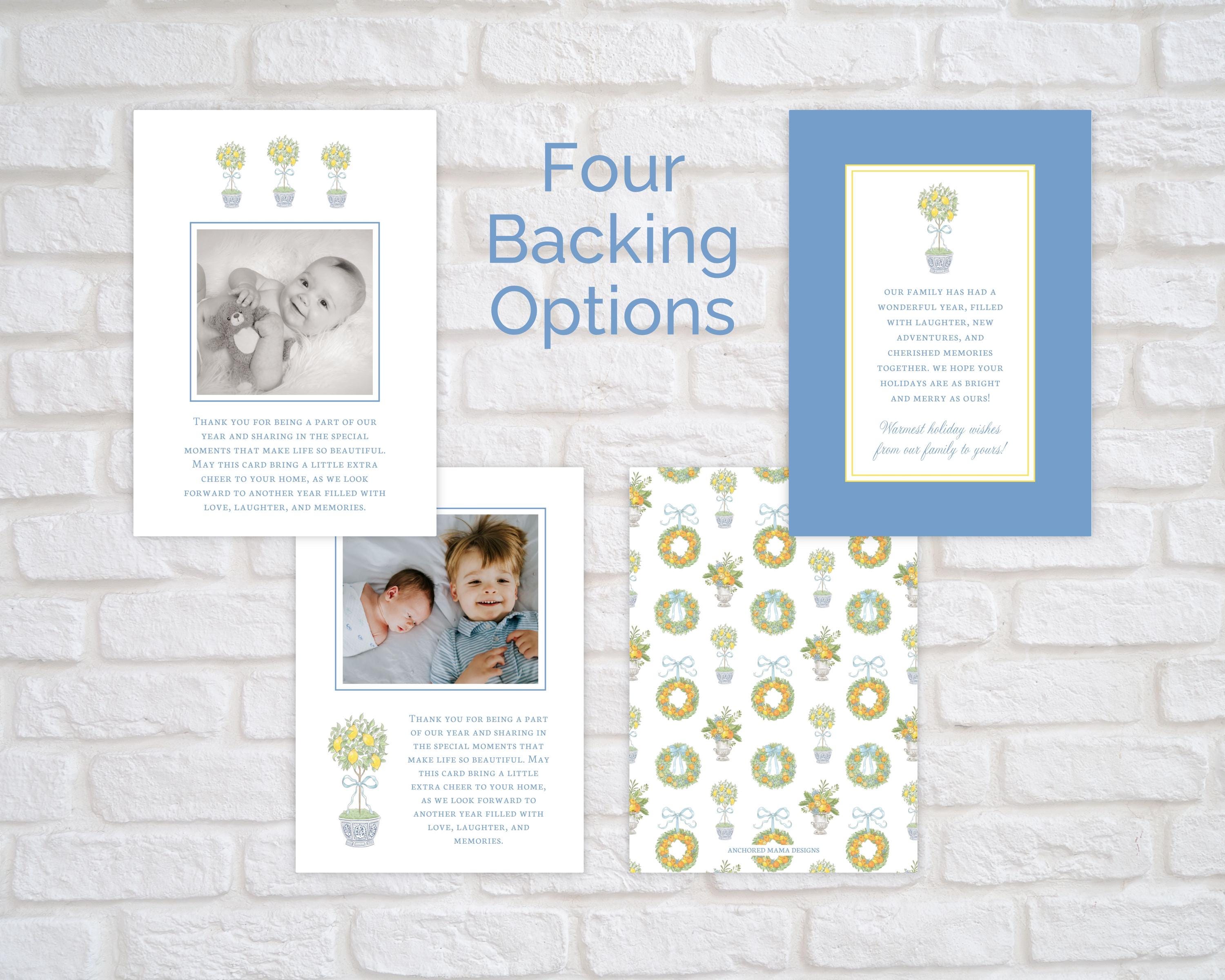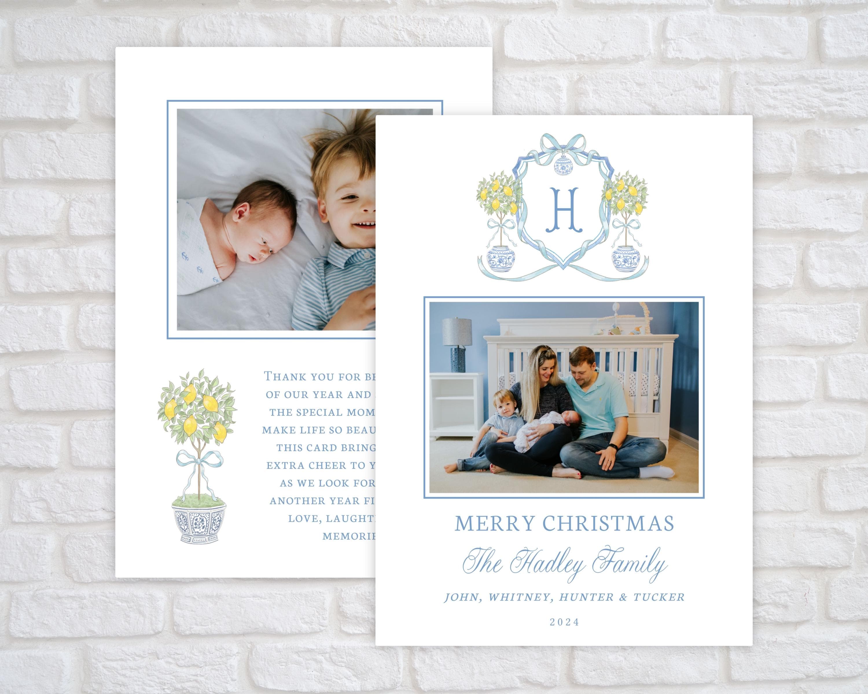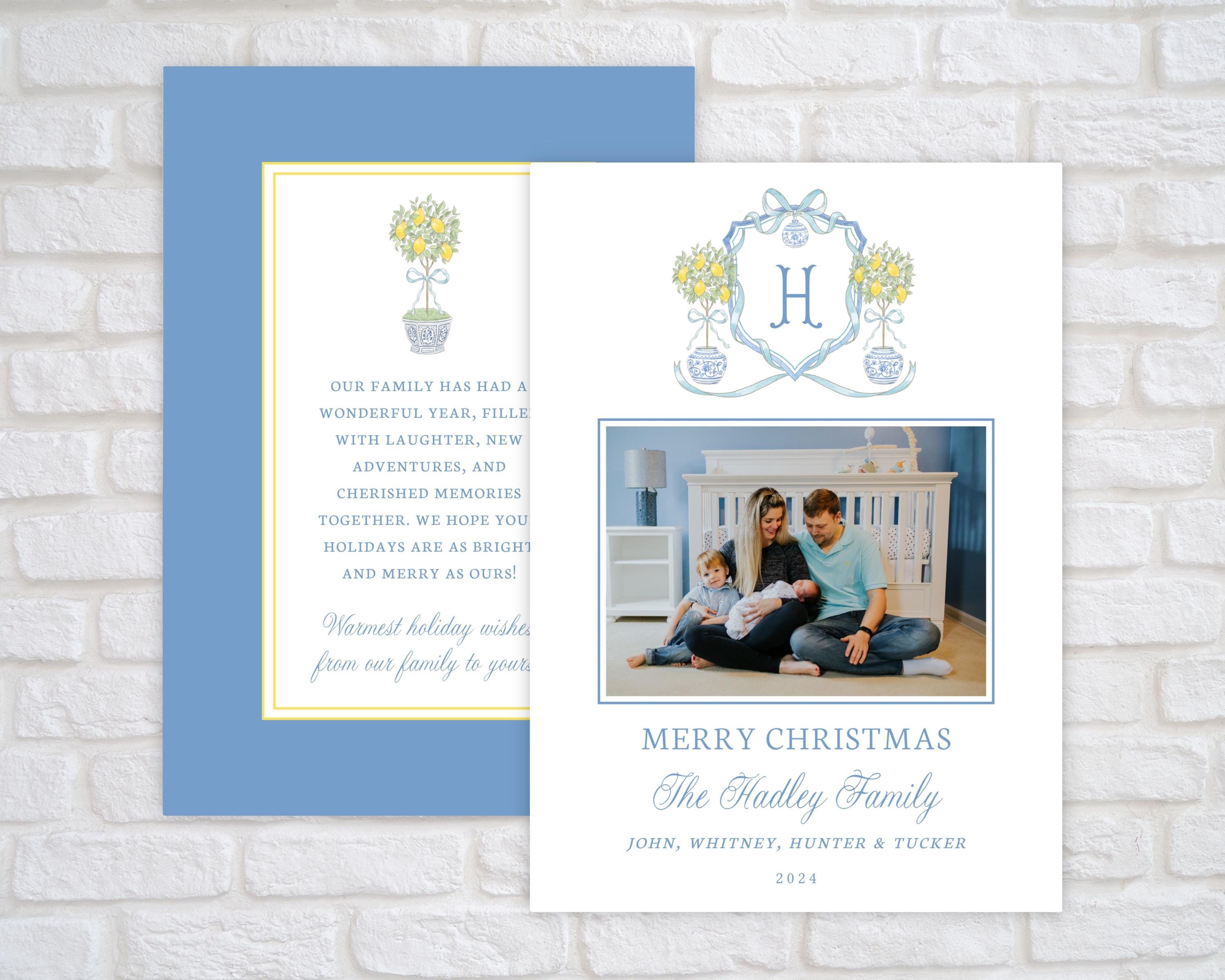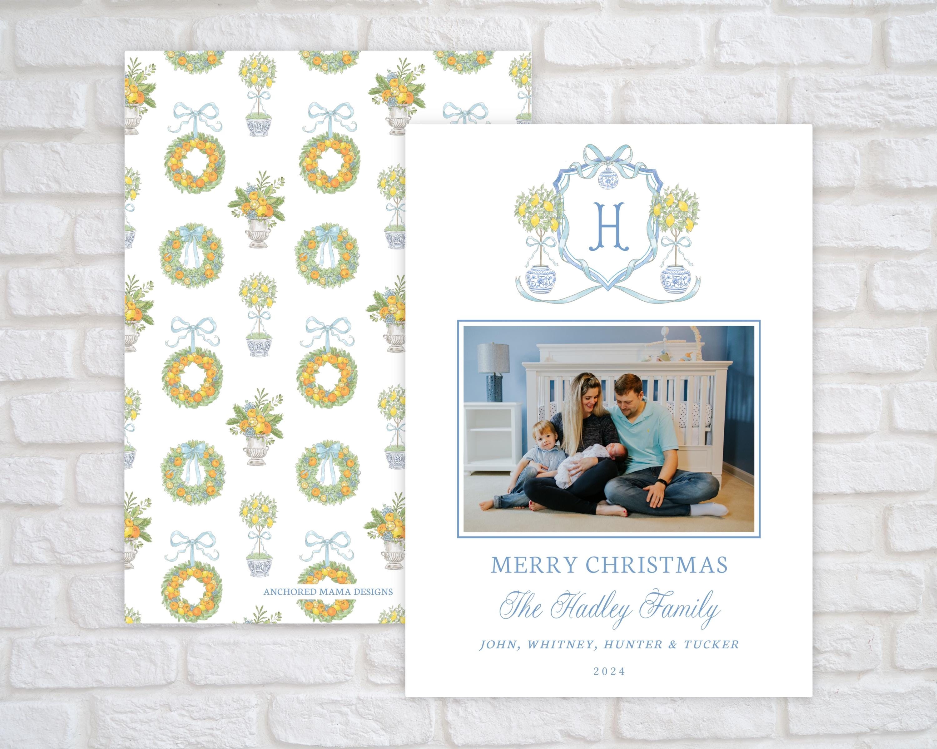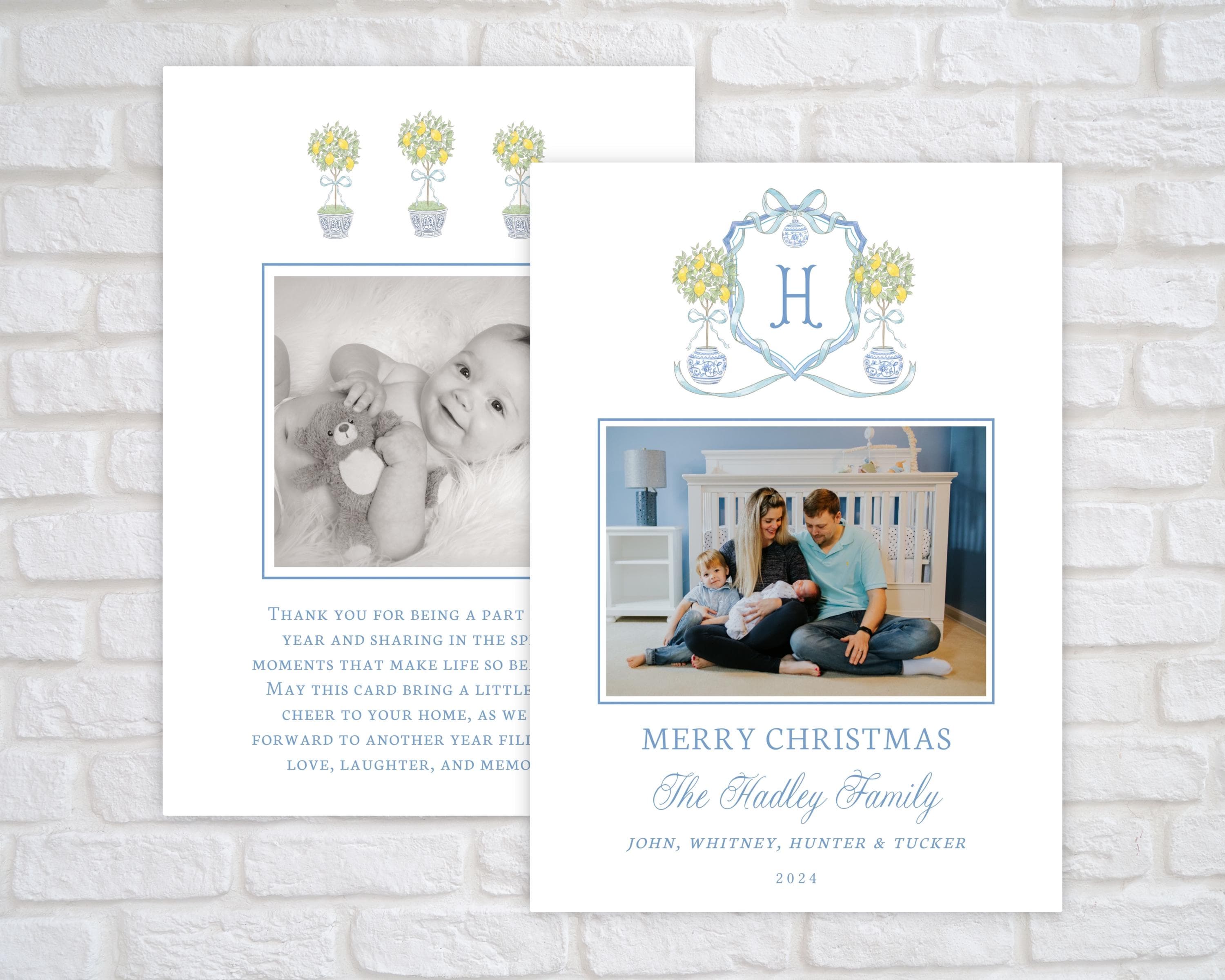 A monogrammed 5"x7" printable chinoiserie lemon topiary Christmas photo card template. This printable card beautifully frames your cherished photos with a sweet touch. Choose from multiple backing options to add extra photos and a holiday message (see listing photos for details). Easily self-edit your photo holiday card with your own text and photos, then download and print!