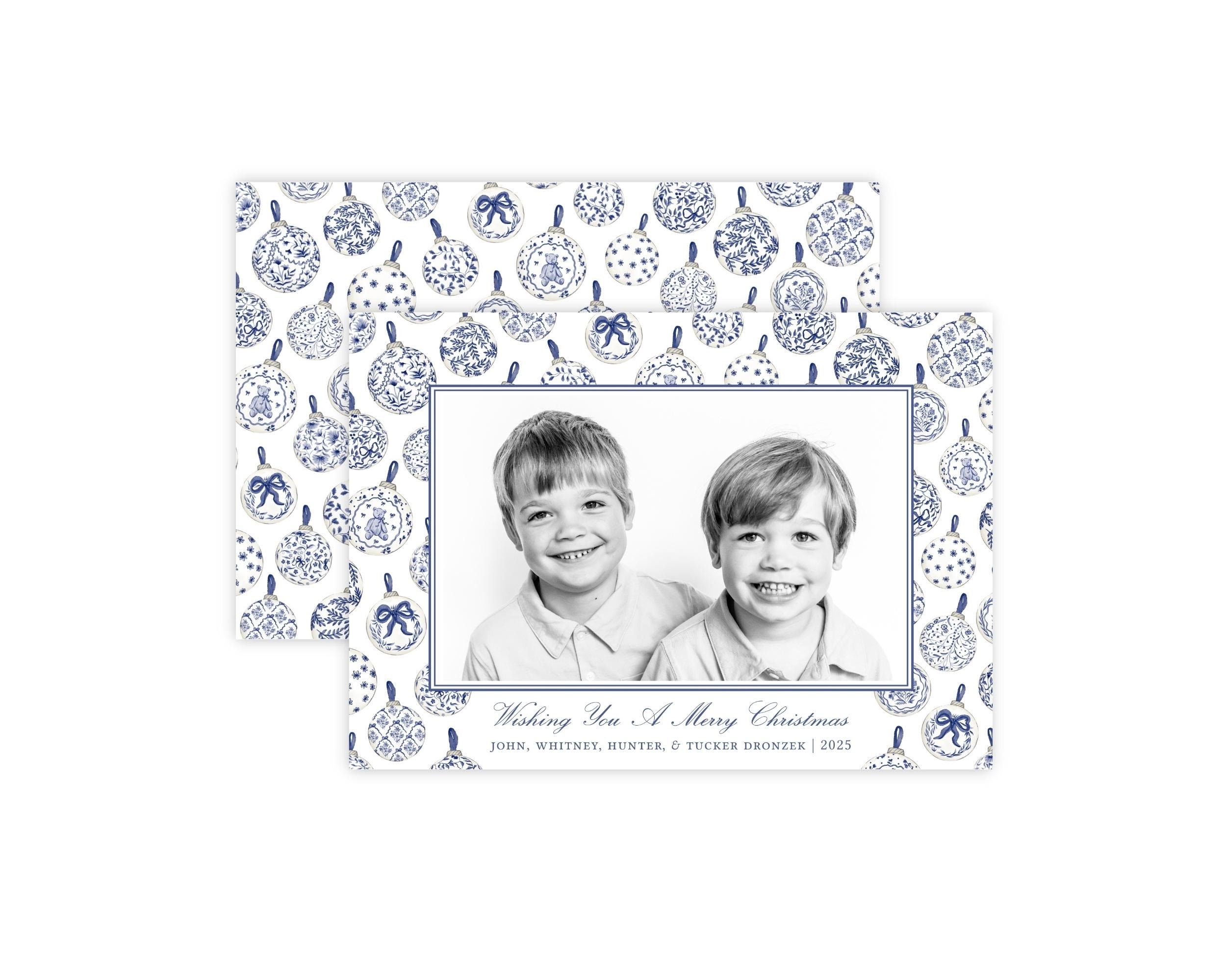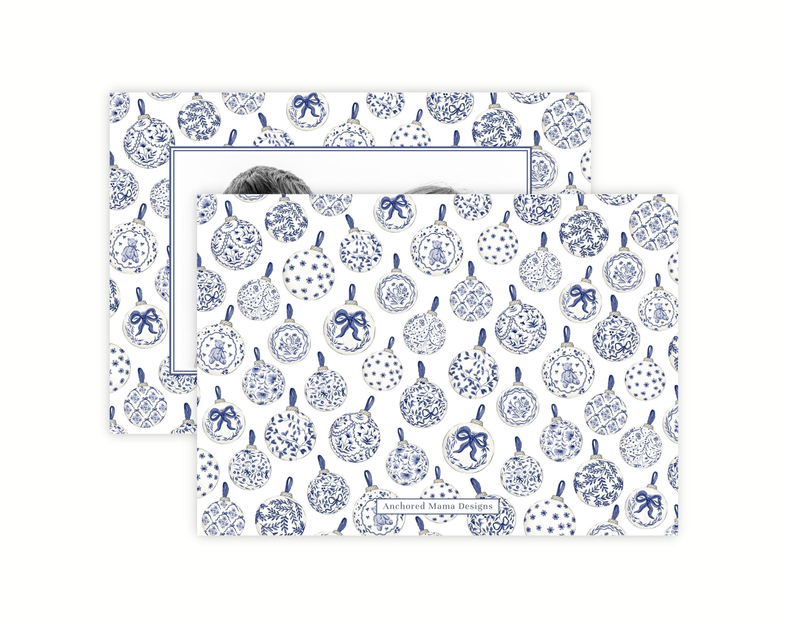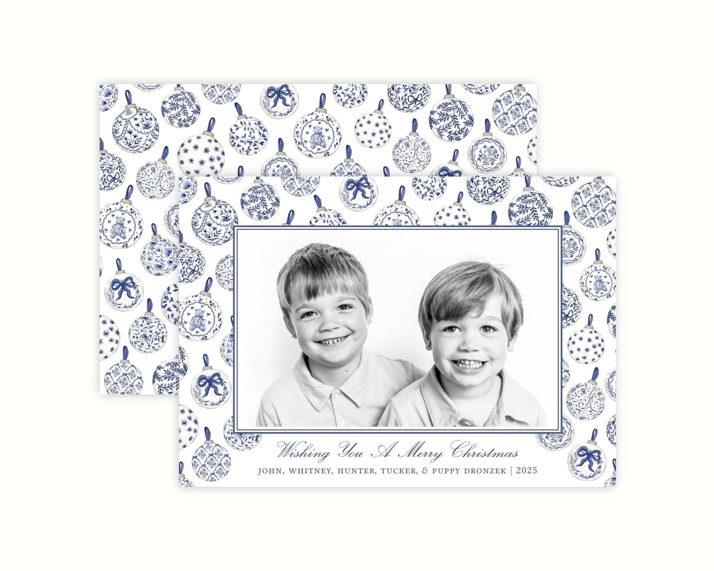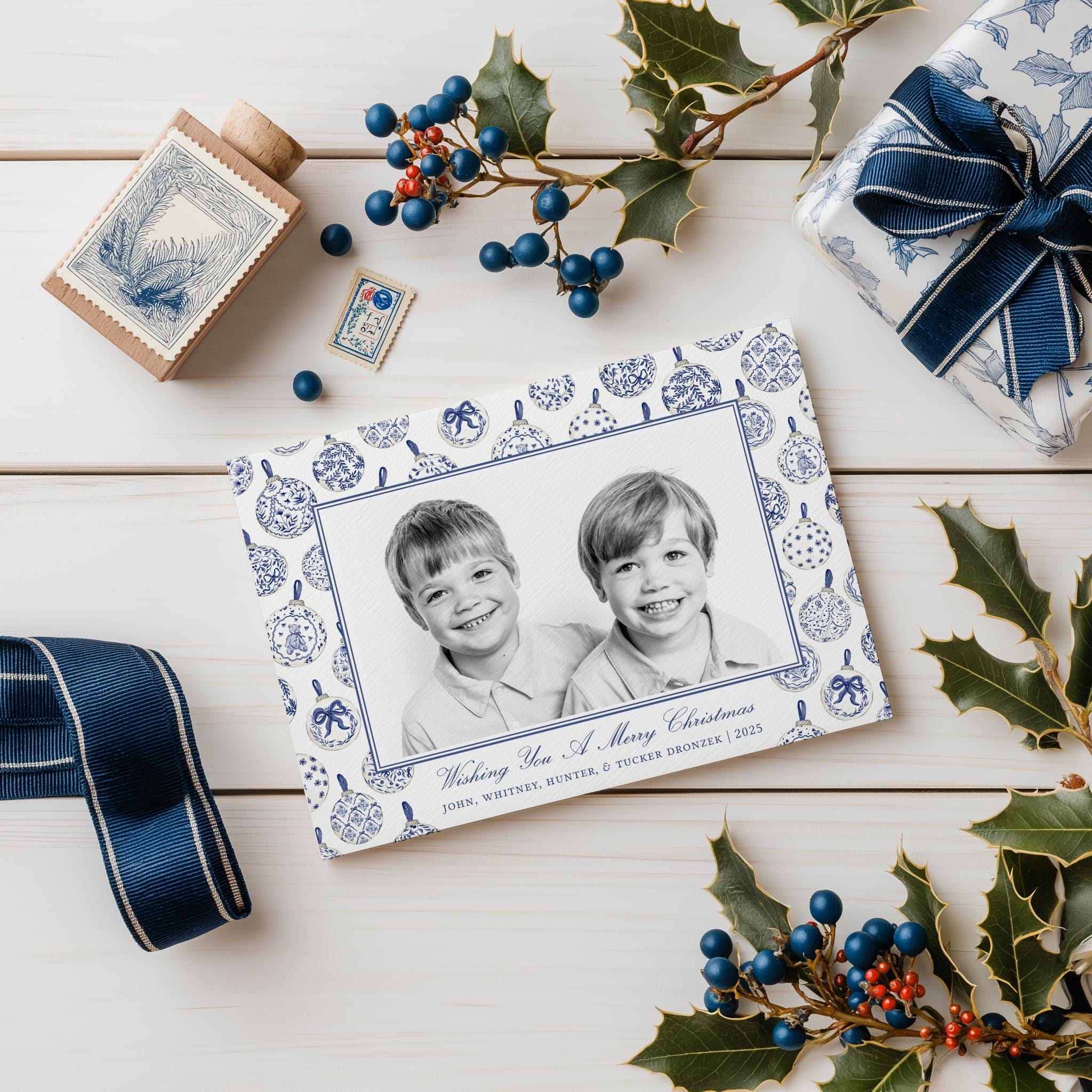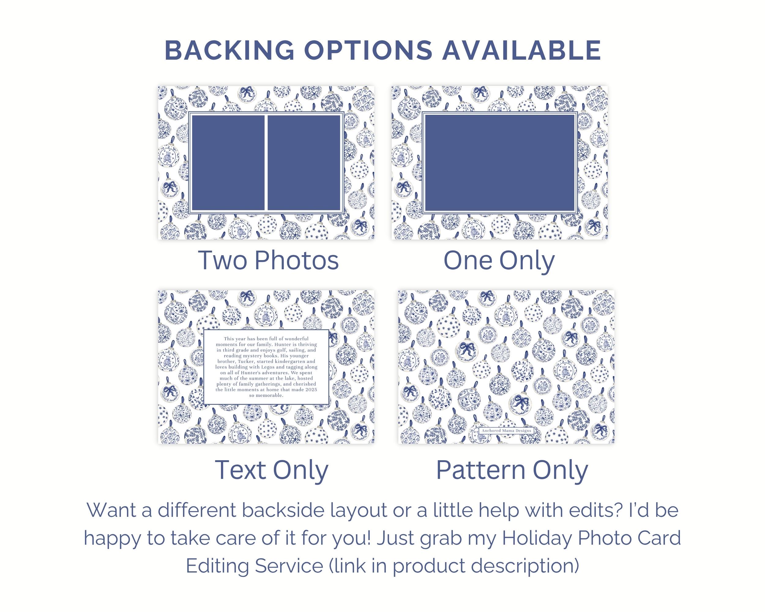 Printable 5"x7" watercolor chinoiserie ornament pattern Christmas photo card. Choose from multiple backing options to add extra photos or a holiday message (see listing photos for details). Easily self-edit your photo holiday card with your own text and photos, then download and print!